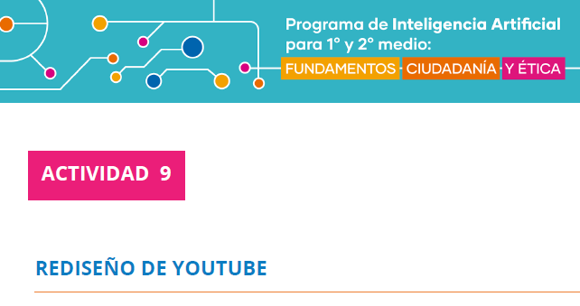 A partir de los resultados de la actividad anterior (N°8), las y los estudiantes realizarán un levantamiento de las partes que pueden estar interesadas o verse afectadas por los resultados del algoritmo, en base a lo cual rediseñarán la experiencia que ofrece la plataforma. Para el prototipado, la guía del estudiante cuenta con un campo en blanco, en el que tendrán que dibujar un boceto. Alternativamente, se puede usar cartulinas, papel Kraft y plumones para crear modelos que se puedan exponer al curso, además de cinta adhesiva para pegar los trabajos.